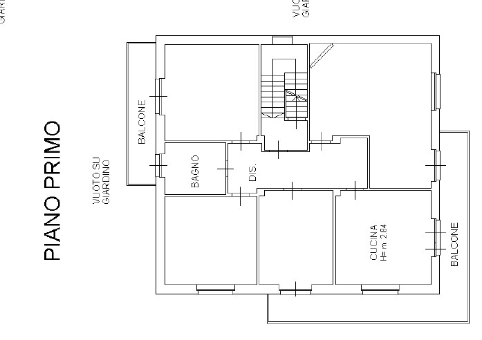 L’abitazione principale si sviluppa al piano primo ed è composta da ingresso su disimpegno, luminoso soggiorno, cucina, tre camere da letto e bagno. Due ampi balconi — uno sul fronte e uno sul retro — garantiscono una piacevole luminosità e affacci aperti su entrambi i lati dell’immobile.